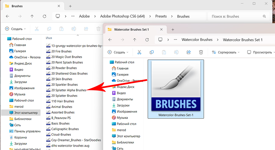 Рис. 27. Перемещение файла с кистями в наборы Photoshop
