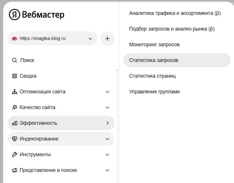 Для этого зайдите в Вебмастер, слева на консоли найдите «Эффективность» – «Статистика запросов» (здесь можно посмотреть по каким запросам искали ваш сайт) и «Подбор запросов и анализ рынка» (здесь можно завести запрос и проследить статистику).