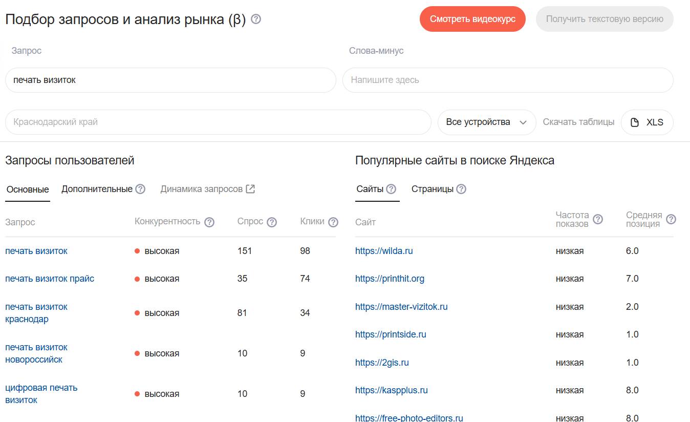 В этом сервисе статистика несколько отличается, но зато здесь можно отследить сразу сайты конкурентов (написаны напротив ключевого слова) и добавить к ключевому слову минус слова. Здесь так же предлагаются похожие ключевые фразы в разделе «Дополнительно». См. рис. 14. Например, с запросом «печать визитки» пользователи ищут эту услугу еще и по дополнительным ключевым словам: «создать визитку», «заказать визитку» и т.д.