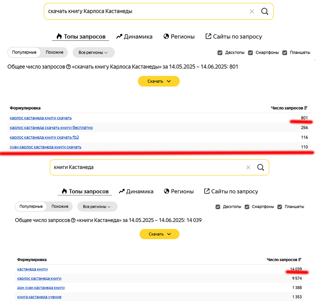 Посмотрите на рисунок 21: ключевая фраза «скачать книгу Карлоса Кастанеды» за месяц была в поиске всего 801 раз, в то время как другая фраза (по смыслу похожая): «книги Кастанеды» была использована 14 039 раз в месяц. Поэтому пишите и создавайте контент не по своему желанию, а по релевантности запросам.
