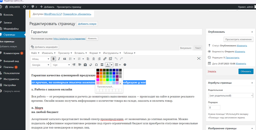 Рис. 21. Редактирование страницы в WordPress в административной части сайта