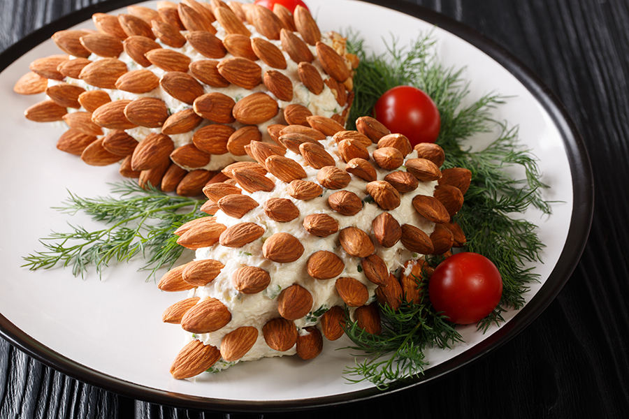 Замечательный новогодний салат в виде еловой шишки из картофеля, курицы, кукурузы, яиц и сыра. Украшается миндалем и веточками зелени. На 3-4 порции, готовится просто, вкус очень оригинальный и изысканный, а форма салата новогодняя, прямо под елочку!