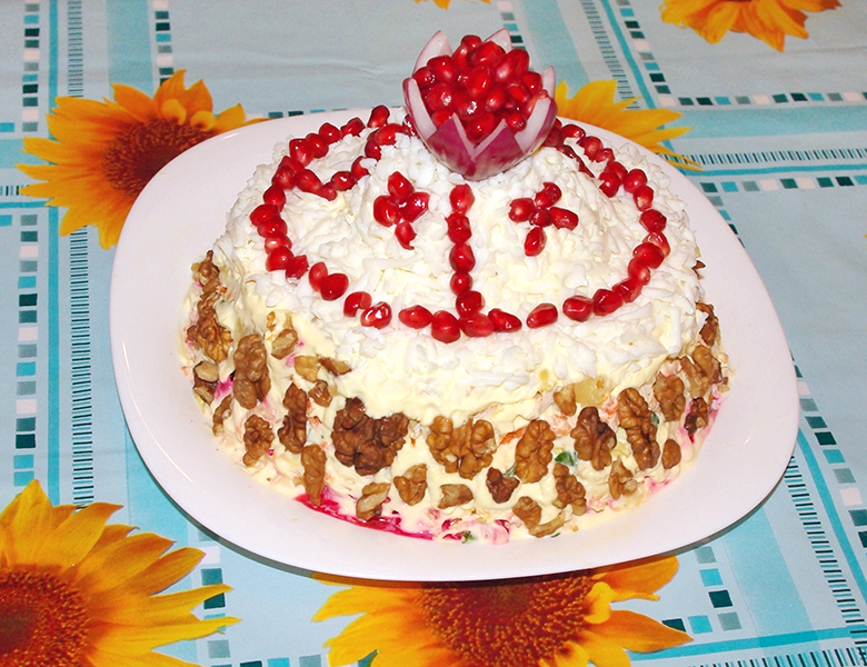2-й слой: свекла + соль + майонез + немного чеснока + грецкие орехи.