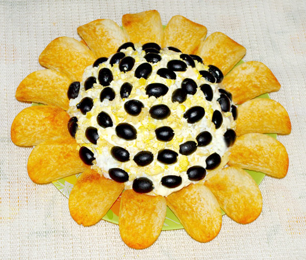 Кто еще не придумал, чем удивить гостей на новогоднем застолье, рассмотрите этот рецепт, успех такой хозяйке гарантирован! Оригинальный салат с чипсами из нежной куриной грудки, маринованных грибочков, яиц, сыра и маслин удивит не только восхитительным вкусом, но и необычной формой в виде подсолнуха. Продукты:
