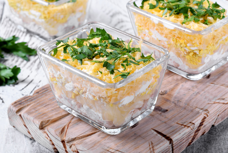 Каждый ингредиент можно по отдельности перемешать с небольшим количеством майонеза и, при необходимости, посолить и поперчить. Или поливать каждый слой салата майонезом по мере выкладывания на блюдо.