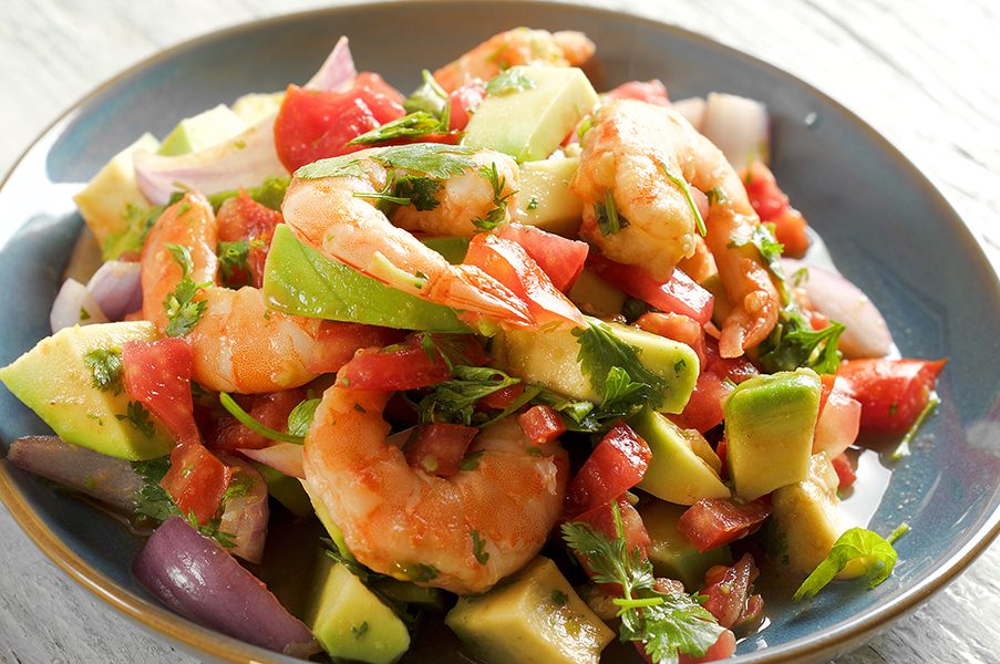 Форму для салата сбрызгиваем маслом, укладываем креветки по кругу как на фото, центр заполняем салатом, кладём в морозилку на 10-15 минут, достаём, переворачиваем на тарелку и украшаем пророщенным лучком.