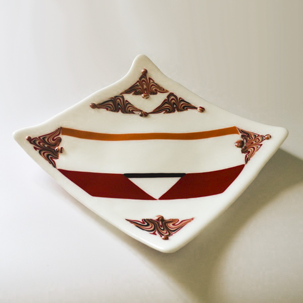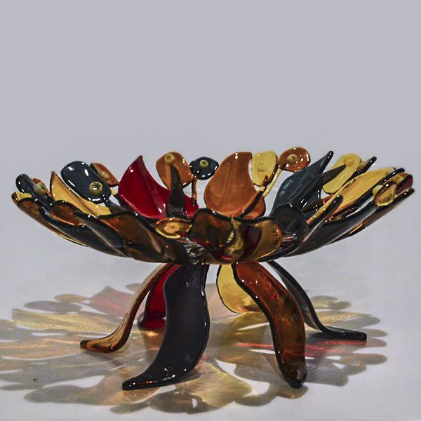 Сама технология сборки такого блюда тоже не часто встречается в работах российских мастеров – это техника наборного стекла. В отличие от традиционного фьюзинга, здесь отсутствует основа, на которую обычно наносится орнамент. В данной технике рисунок одинаково прекрасен и с верхней, и с нижней стороны.