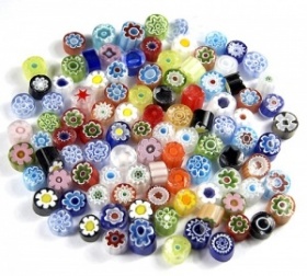 По этой технологии изготавливается сегодня известное мозаичное стекло миллефиори – рубленные прутики диаметром 7–8 мм. Эти прутики изготавливаются из тонких цветных стеклянных стержней, образуя на срезе различные рисунки – цветочки, звездочки, фигурки животных.