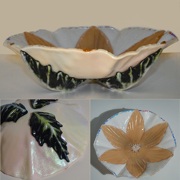 Одним из примеров использования литых стеклянных элементов является изготовленное мною блюдо «Жемчужное сияние», украшенное фигурными ножками. Отлитые из стеклянной крошки листики служат здесь в качестве уникальных и стильных ножек для блюда, добавляя ему оригинальность и изысканность. Это прекрасный пример того, как литье стекла в формы может быть использовано для создания функциональных и декоративных предметов, которые радуют глаз и приносят удовольствие в повседневной жизни.