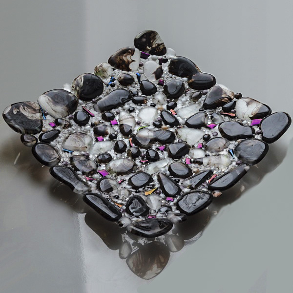 Затем блюдо спечено воедино в технике наборного стекла с добавлением стеклянной крошки и кусочков дихроичного стекла.