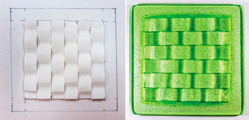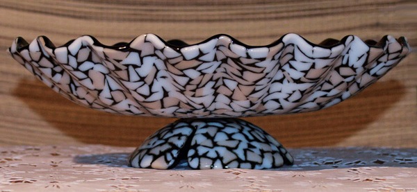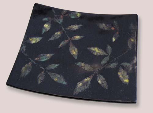 Я использовала эту технику с прозрачным стеклом. Но можно использовать и матовое стекло. Тогда лицевая сторона изделия будет та, что при обжиге была нижней.
