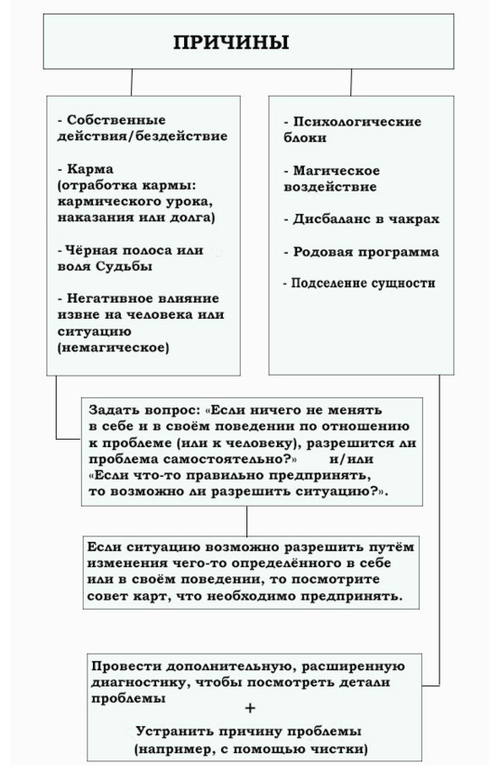 В некоторых случаях, в зависимости от выявленной причины проблемы, нет необходимости спрашивать совет карт о том, как разрешить ситуацию, так как и без карт становится понятно, что нужно убрать причину, создавшую вашу проблему.