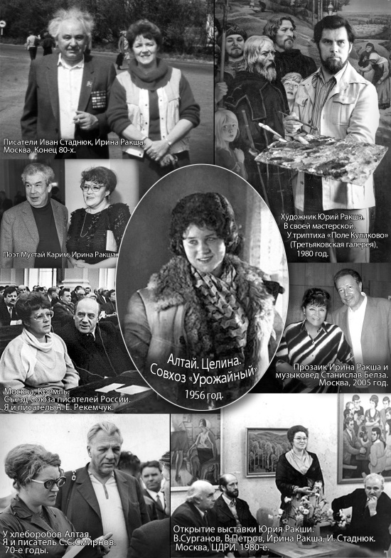 Ирина Евгеньевна Ракша́ – академик, действительный член Академии российской словесности. Писатель, кинодраматург, член Союза журналистов СССР и РФ (с 1965 г.), член Союза писателей СССР и РФ (с 1969 г.). Вдова художника Юрия Ракши (1937–1980), имела дочь Анну Юрьевну. (Член Союза художников РФ. Дочь скончалась 13 мая 2017 года. Аневризма.)