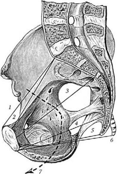 1 – анатомическая конъюгата: 2 – истинная конъюгата; 3 – прямой размер широкой части полости малого таза; 4 – прямой размер узкой части полости малого таза; 5 – прямой размер плоскости выхода из малого таза во время беременности; 6 – прямой размер плоскости выхода из малого таза в родах; 7 – проводная ось таза