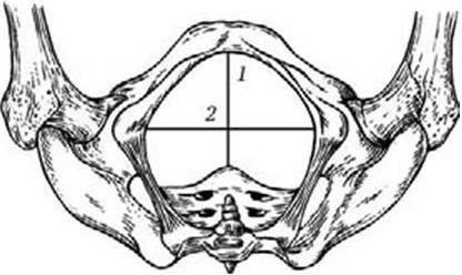 Плоскость широкой части полости малого таза спереди ограничена серединой внутренней поверхности симфиза, с боков – серединой пластинок, закрывающих вертлужные впадины, сзади – местом соединения II и III крестцовых позвонков. В широкой части полости малого таза различают 2 размера: прямой и поперечный. Прямой размер – расстояние между местом соединения II и III крестцовых позвонков. В широкой части полости малого таза различают 2 размера: прямой и поперечный. Прямой размер – расстояние между местом соединения II и III крестцовых позвонков и серединой внутренней поверхности симфиза. Он равен 12,5 см. Поперечный размер – расстояние между серединами внутренних поверхностей пластинок, закрывающих вертлуж-ные впадины. Он равен 12,5 см. Так как таз в широкой части полости не представляет сплошного костного кольца, косые размеры в этом отделе допускаются лишь условно (по 13 см).