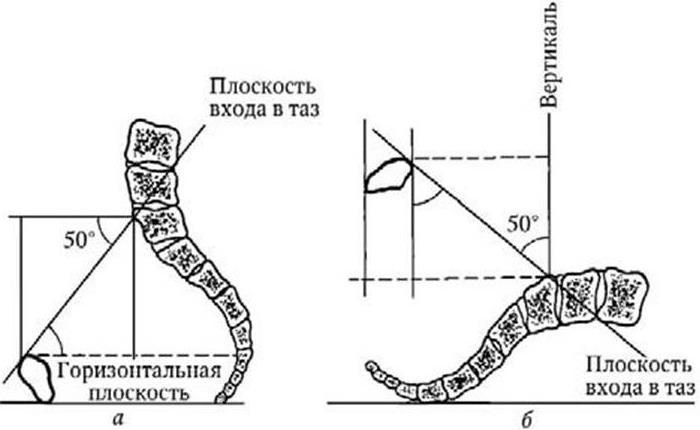 Можно определить величину угла наклонения таза по положению обеих остей подвздошных костей относительно лобкового сочленения. Угол наклонения таза будет нормальным (45 – 50°), если при горизонтальном положении тела женщины плоскость, проведенная через симфиз и верхние передние ости подвздошных костей, параллельна плоскости горизонта. Если симфиз расположен ниже плоскости, проведенной через указанные ости, угол наклонения таза меньше нормы.