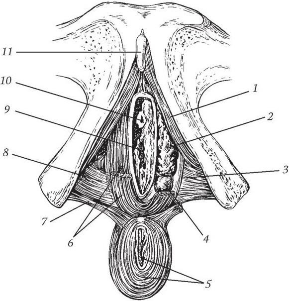 1 – m. ischiocavernosus; 2 – bulbus vestibuli; 3 – m. transversus perinei profundus; 4 – glandula vestibularis major; 5 – anus et m. sphincter ani externus; 6 – m. bulbospongiosus; 7 – m. transversus perinei superficialis; 8 – fascia diaphragmatis urogenitalis inferior; 9 – ostium vaginae; 10 – ostium uretrae externum; 11 – clitoris