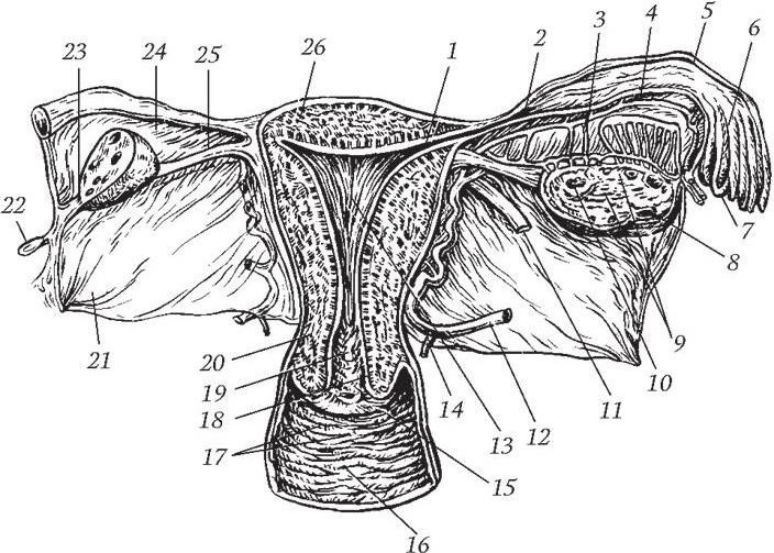 14 – r. vaginalis a. uterinae; 15 – ostium uteri; 16 – columna rugarum anterior; 17 – rugae vaginales; 18 – plicae palmatae; 19 – canalis cervicis uteri; 20 – cervix uteri; 21 – lig. latum uteri; 22 – lig. teres uteri; 23 – mesovarium; 24 – mesosalpinx; 25 – lig. ovarii proprium; 26 – fundus uteri