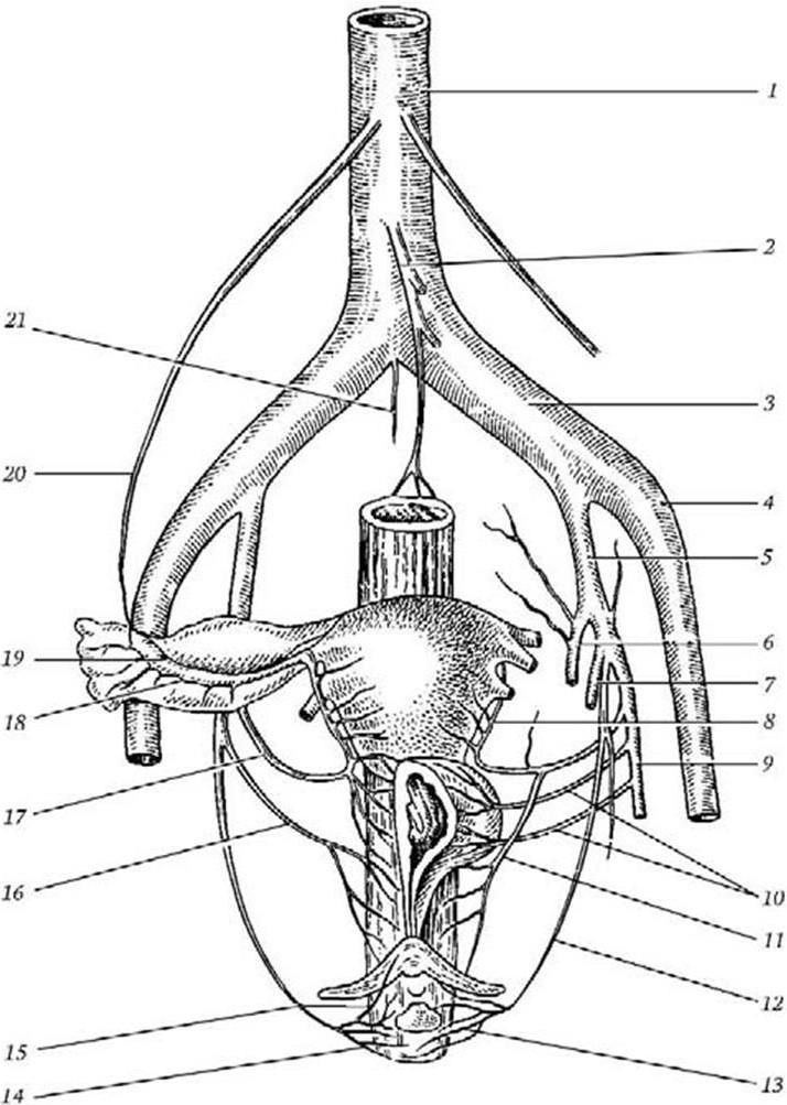 1 – aorta abdominalis; 2 – a. mesenterica inferior; 3 – a. iliaca communis; 4 – a. iliaca externa; 5 —a. iliaca interna; 6 – a. glutea superior; 7 – a. glutea inferior; 8 – a. uterina; 9 – a. umbilicalis; 10 – aa. vesicales; 11 – a. vaginalis; 12 – a. pudenda interna; 13 – a. perinealis; 14 – a. rectalis inferior; 15 – a. clitoridis; 16 – a. rectalis media; 17 – a. uterina; 18 – r. tubarius a. uterinae; 19 – r. ovaricus a. uterinae; 20 – a. ovarica; 21 – a. sacralis mediana
