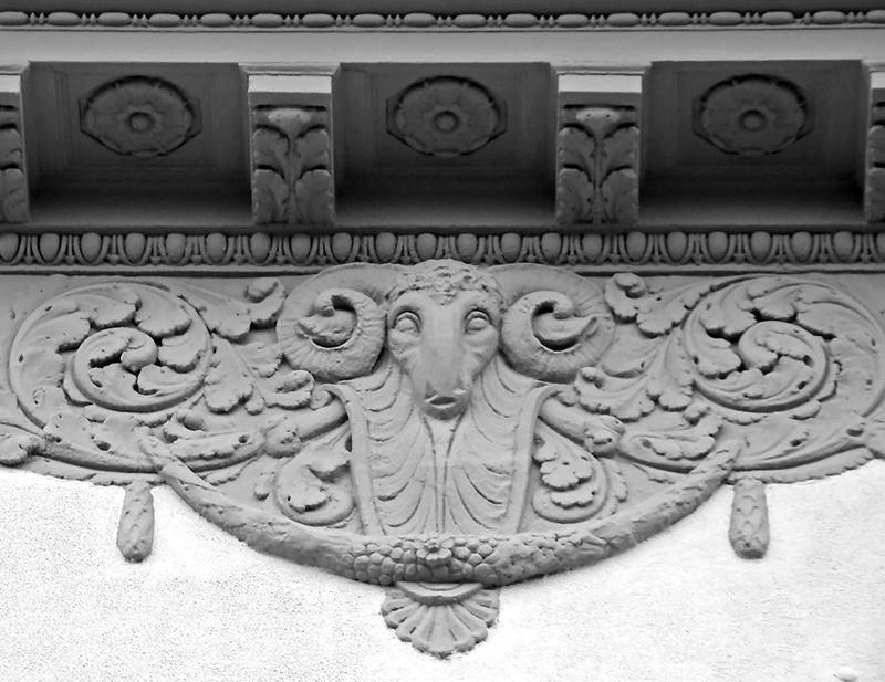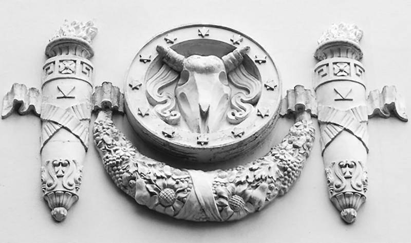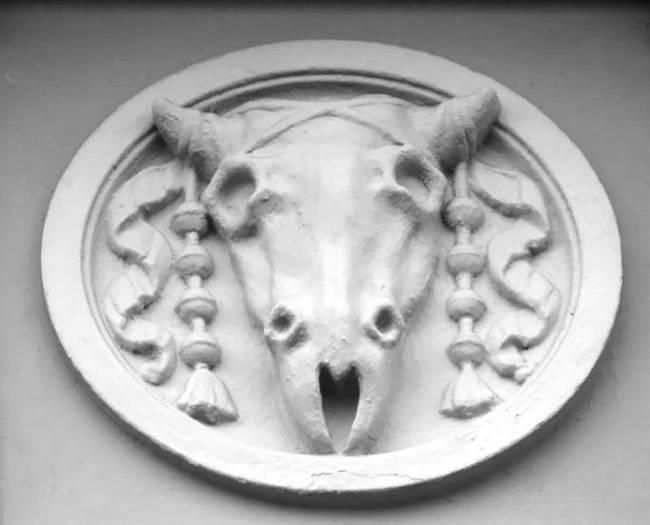 Одним из древнейших апотропеев является маскарон с изображением черепа жертвенного животного – букраний, что в переводе с греческого означает «бычий череп». Он также пришел к нам из времен античности. Дополненный гирляндами и жертвенными сосудами, он украшал культовые постройки, гробницы и алтари, напоминая о жертве богам и таинстве смерти. Со временем название «букраний» перешло на все маскароны с головой животного, и их стали использовать в архитектуре как дань античной традиции.