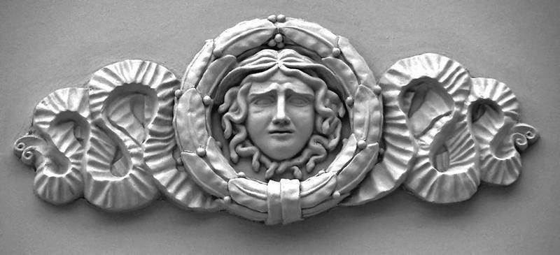 Изображение Медузы горгоны, взгляд которой превращал героев в камень, можно в изобилии увидеть на московских фасадах. Старопосадский пер., 8