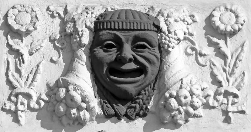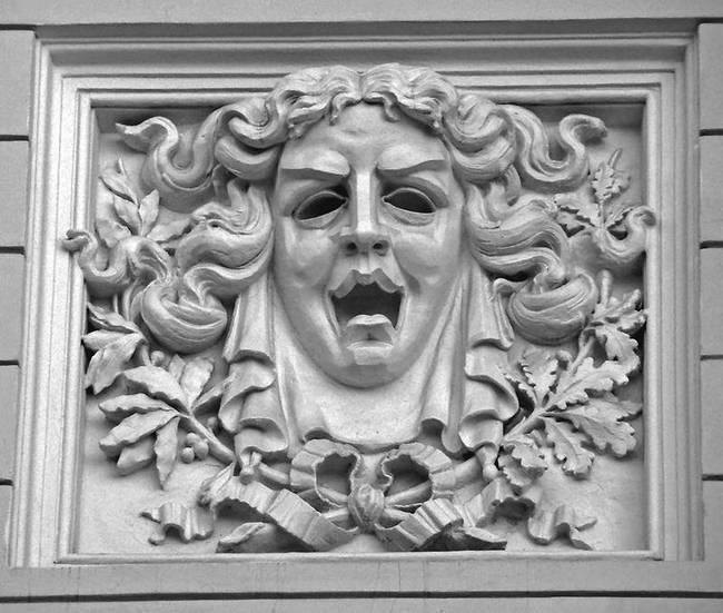 Помимо устрашающих масок, маскароны часто имели лик театральных масок. Их можно в изобилии увидеть на московских фасадах, где они присутствуют в качестве эмблемы театрального искусства, как атрибут покровительниц театра муз Терпсихоры, Мельпомены и самого Аполлона-мусагета (музоводителя). А вот сами театральные маски появились гораздо раньше, в античные времена, так как актерами в те времена были только мужчины, которым запрещалось выходить к публике без маски. Причем женский персонаж отличался от мужского только цветом маски: белый – женский, темный – мужской.