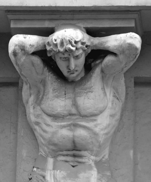 Прекрасные атланты-куросы (дох. дом, 1916, арх. С.М. Гончаров). Староконюшенный пер., 39