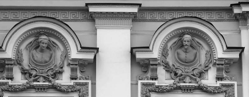 Отдельным направлением декоративного убранства нашего города являются загадочные маскароны, задумчивые и печальные, грозные и угрюмые, прекрасные и таинственные каменные лики (декоративные рельефы в виде маски, человеческого лица или головы животного), украшающие фасады, капители домов, ограды лестниц и мостов. Маскароны – это лицо здания, его портрет, его судьба.