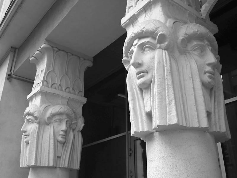 Фриз дома треста «Теплобетон» украшен барельефом с тремя аллегорическими фигурами, изображающими Технику, Искусство и Науку. Спиридоновка, 24/1