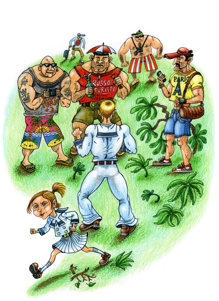 Вдруг на лесную тропинку наперерез нашим героям высыпала компания туристов. Все они, как на подбор, оказались дюжими мужиками. А в целом эта композиция из горы мускулов очень напоминала свиту телохранителей президента, пару месяцев назад разом погибших от внезапной утечки газа на загородной вилле.
