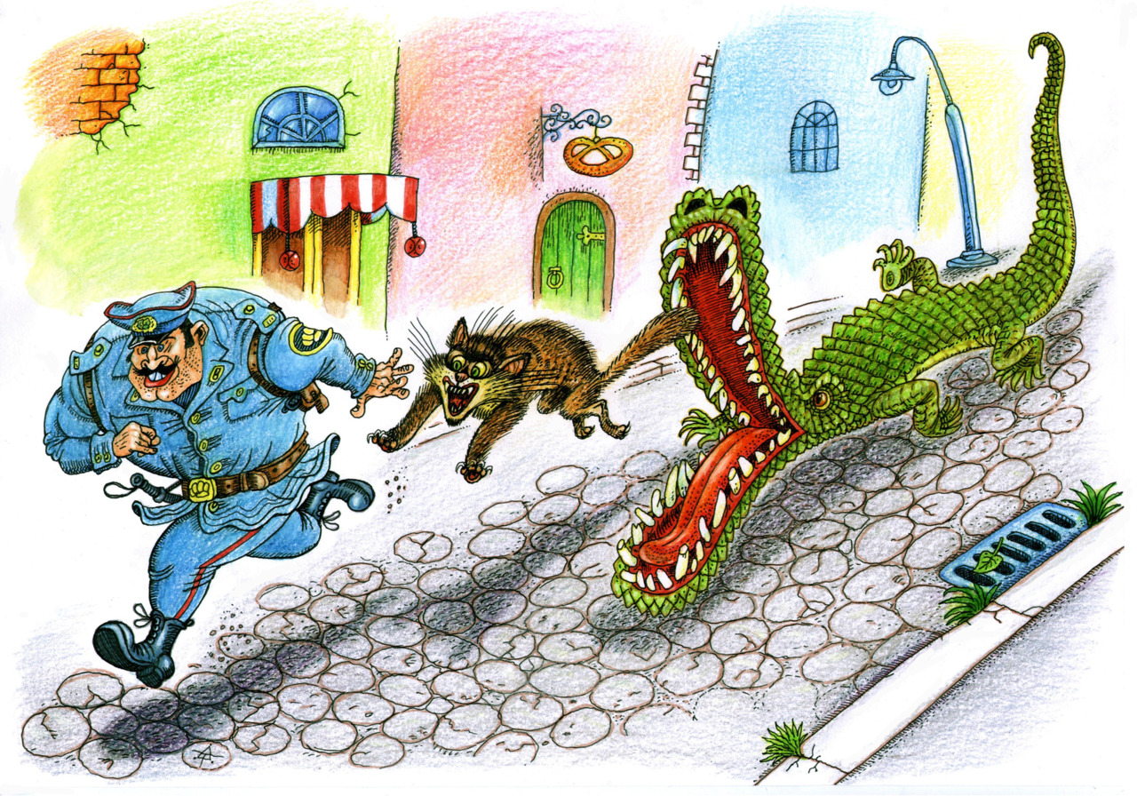 Вот это зрелище! По середине улицы несется взмыленный полицейский, спасаясь от разъяренного кота. В свою очередь кота за хвост пытается поймать голодно лязгающий зубами крокодил.