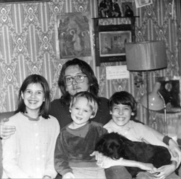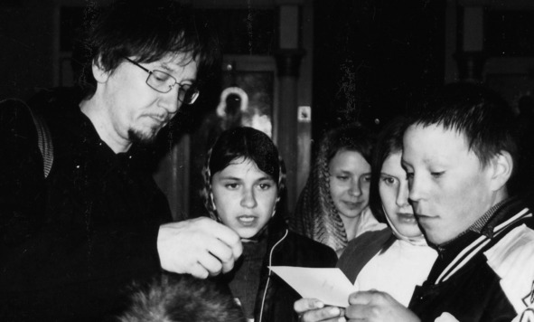 Т. Травник с детьми в мастерской в Ясенево. Москва. 1992 г.
