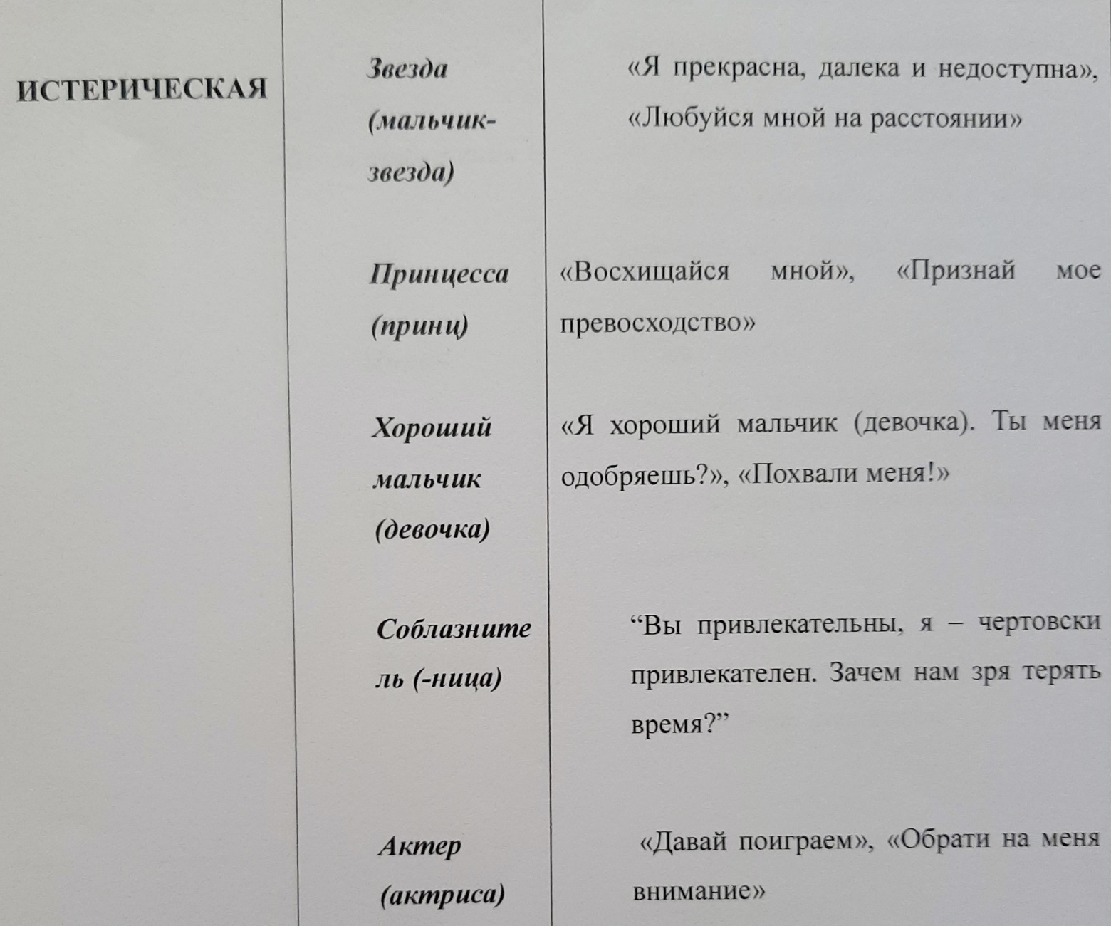 А в других школах под нарциссическим типом понимают генитальный, формирующийся в возрасте 3-6 лет. Его поведение сексуализировано, он соблазняет представителей противоположного пола и конкурирует с представителями своего пола. Не способен на сердечную связь, на любовь к другому человеку – ему нужно, чтобы любили его. Помните Казанову?..