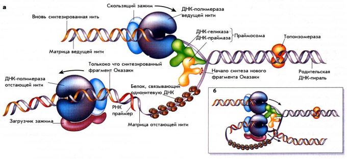 В представленной на вставке б схеме репликационной вилки показано, что ДНК-полимераза отстающей нити остается связанной с ДНК-полимеразой ведущей нити. Это позволяет ДНК-полимеразе отстающей нити оставаться внутри вилки после того, как завершен синтез очередного фрагмента Оказаки. В результате, одна и та же полимераза снова и снова участвует в синтезе большого числа фрагментов Оказаки, необходимых для образования новой цепи ДНК на отстающей нити.