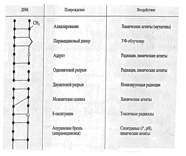 Ультрафиолетовые лучи вызывают образование пиримидиновых димеров, 6,4-фотопродуктов, аддуктов, разрывов и прочие повреждения ДНК. Под действием химических агентов происходят разного рода модификвции нуклеотидов, возникают межнитевые сшивки, конформационные дефекты. Двунитевые разрывы могут приводить к перестройкам хромосом, что и является главной причиной летального действия ионизирующей радиации.