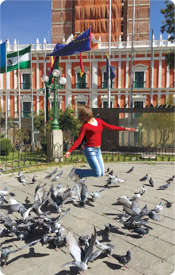 Эта фотография сделана на Центральной площади столицы Боливии города Ла-Пас. Город грязный, опасный, со множеством бедных районов, но на Центральной площади как-то гармонично сосуществует весь этот местный колорит с национальной и архитектурной красотой, а множество голубей вдохновляют на полёт.