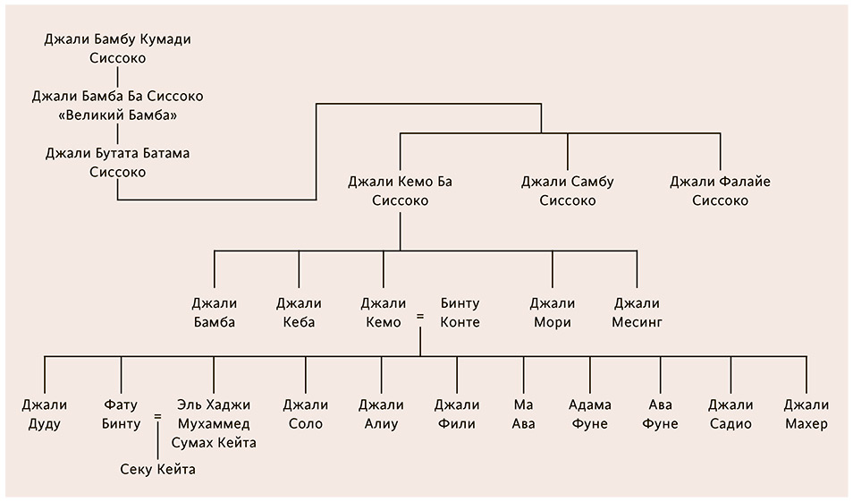 Гриоты представляют собой узкую эндогамную группу, то есть они создают семью внутри своей касты. «Гриотом надо родиться» – гласит пословица. Необходимо отметить, что в кастовом обществе правила особенно строгие, когда дело касается супружеских отношений. И сейчас сложно, если не невозможно, заключить брак между членами разных социальных классов. Африканцы традиционно стараются избегать смешения крови, поэтому запрещается вступать в брак представителям разных социальных сред. Анализ африканского фольклора также доказывает, что любовь – не главное в семейной жизни. Ни в одной африканской сказке не найти такой распространенной в европейском фольклоре концовки, как «они полюбили друг друга, поженились, родили детей и жили счастливо». Традиционная религия африканских народов тоже не проповедовала брак между мужчиной и женщиной как союз любящих сердец. Возможно, это главная причина того, что гриоты дожили до наших дней. Каста гриотов – одна из самых устойчивых социальных и профессиональных групп африканского общества. Многие семьи гриотов Западной Африки имеют богатую родословную. В подтверждение приведем генеалогическое древо одной из уважаемых и известных семей гриотов Мали – Сиссоко.