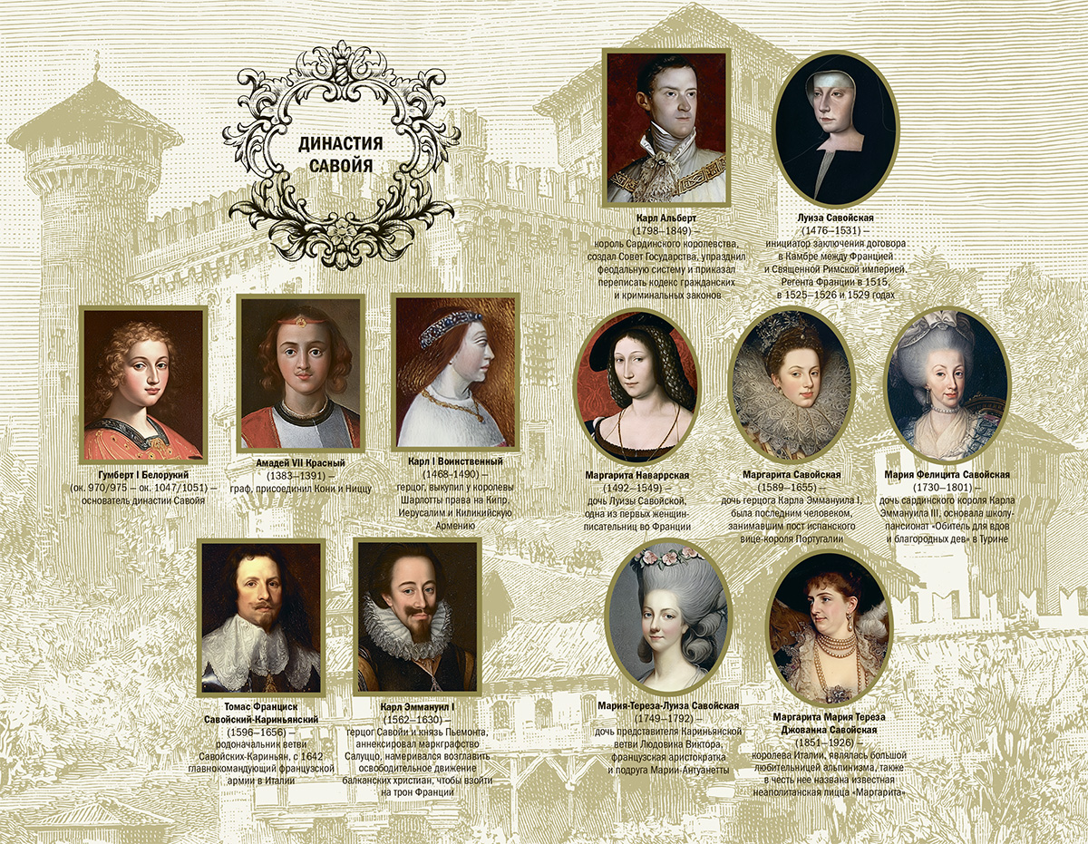 Как же им удалось выжить в течение такого долгого периода времени, несмотря на бесконечные войны, борьбу за власть с другими феодалами и родственные браки? Ведь многие династии вымерли и от них остались только воспоминания. Среди членов дома Савойя были разные персонажи: бесстрашные рыцари, которые завоевывали новые земли и принимали участие в Крестовых походах, умелые политики и дипломаты, представители духовенства, и даже один папа римский. Но были и совсем противоположные, противоречивые личности. Попадались также скучные, легкомысленные и ничем не выдающиеся люди. Савойя были участниками всех военных конфликтов, которые известны в Европе со времен Средневековья и до наших дней.
