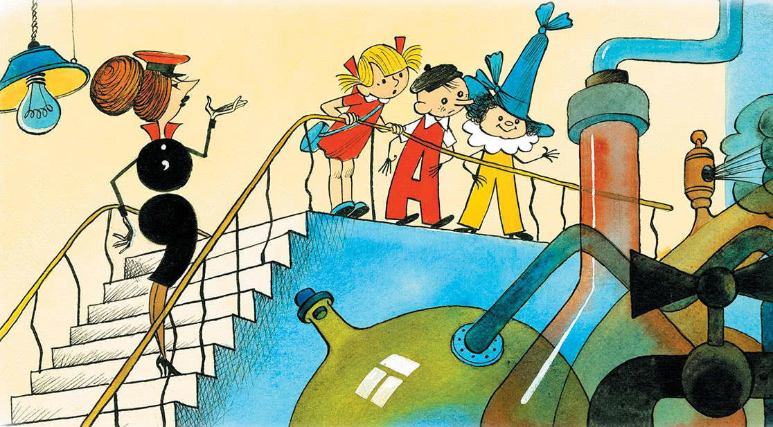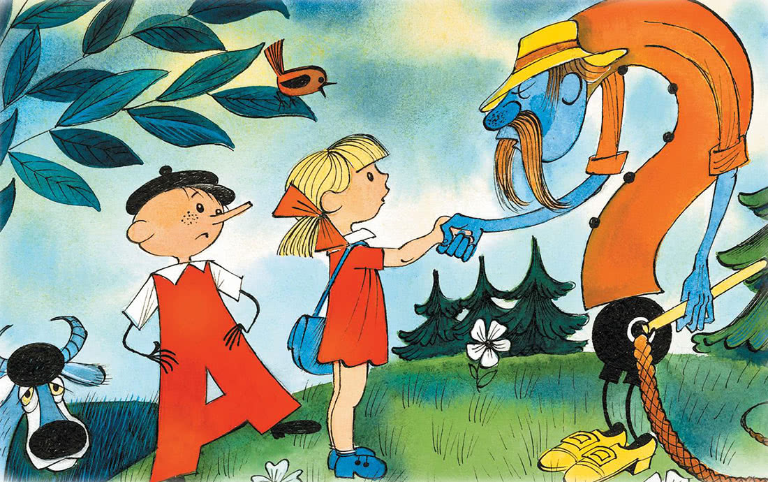 Ну, наконец-то буква Б отступила! Аля и буква А вошли в ворота. За воротами зеленел лужок. На траве паслись двоеточия. За ними, щёлкая кнутом, ходил пастух вопросительный знак.