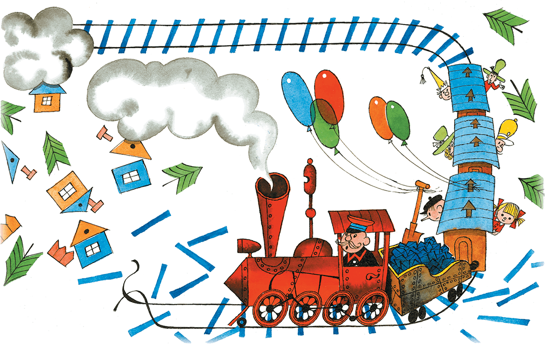 – Ты забыла: ведь у нас есть читатели! Они нас выручат из беды. За работу, дорогие читатели! Все на ремонт путей! Укладывайте шпалы! Заодно почините домики и насадите побольше ёлочек: дороге нужна лесозащитная полоса!