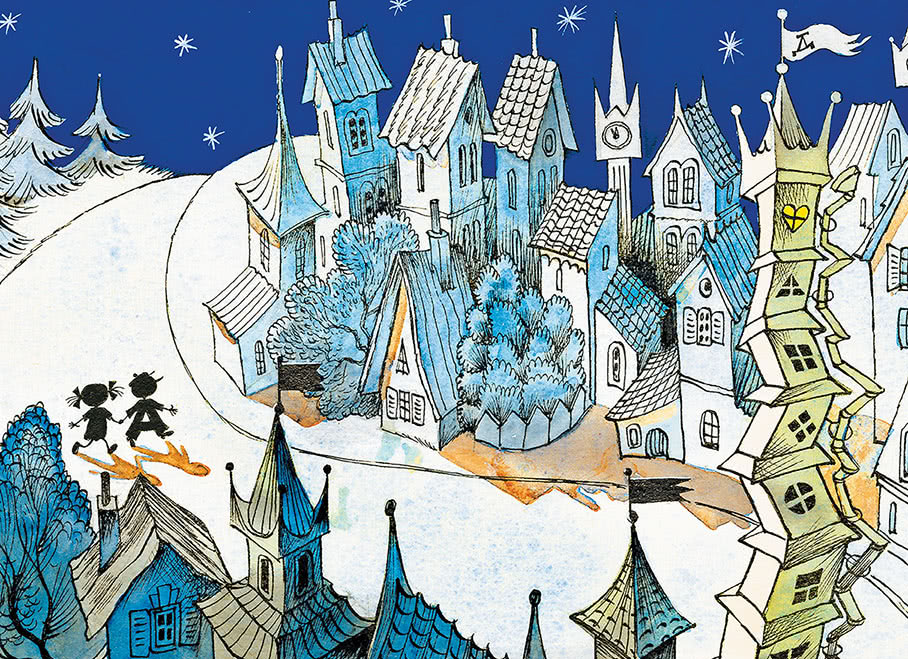 Взошла луна. Настала самая настоящая ночь. Надо было где-то устраиваться на ночлег. Огни в окнах погасли. Только в одном, самом высоком доме горело крошечное окошечко под самой крышей.