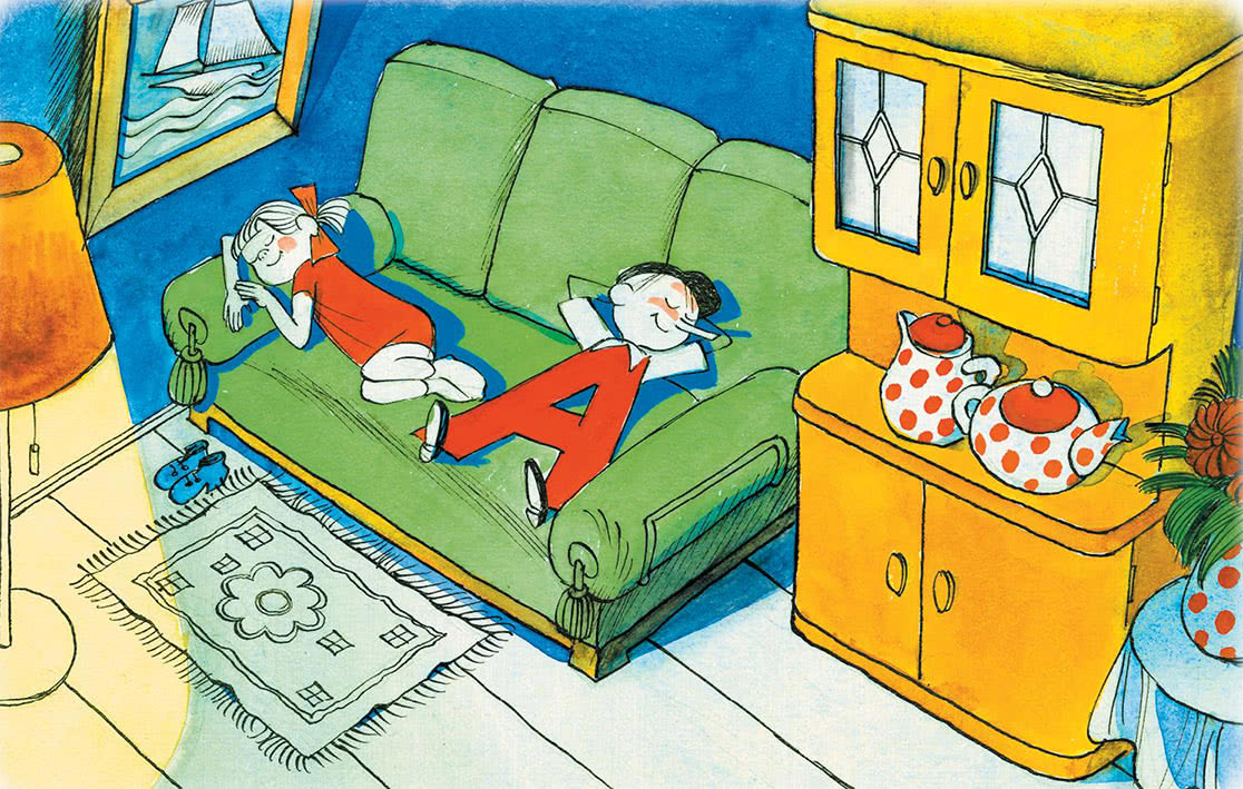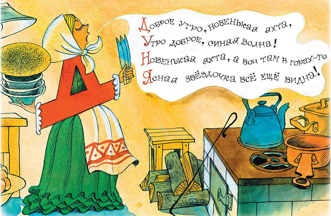 Аля и буква А прилегли на диван. Дуня отправилась в кухню. Она стучала тарелками и ножами и тихонечко напевала: