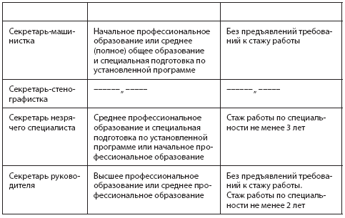 Требования к статусу также не очень высоки: только секретарь руководителя, имеющий среднее профессиональное образование, должен иметь стаж работы по специальности не менее 2 лет, а секретарь незрячего специалиста при начальном профессиональном образовании – не менее 3 лет.