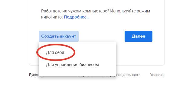 Выбираем «Создать аккаунт». Программа спрашивает: «Для себя или для бизнеса?»