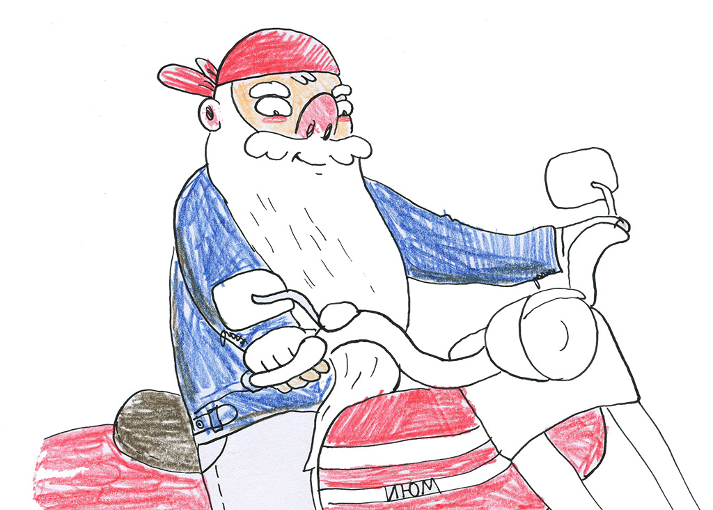 – На мотоцикле! – Вера ткнула пальцем в байкера. У того была длинная белая борода, красный нос. Но где вы видели деда Мороза в рокерской куртке с металлическими заклепками, кожаных штанах и ярко-зелёных ботинки на высокой шнуровке?