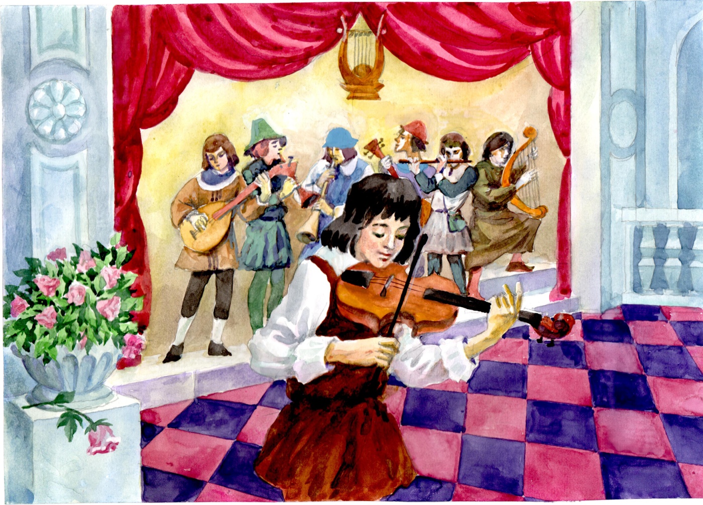 Выступление незнакомца заворожило придворных и королевскую чету. Никто никогда не играл так восхитительно под сводами этого зала. Его величество повелел скрипачу остаться при дворе. Музыкант обрадовался, ему понравилась принцесса, он был счастлив дарить мелодии очаровательной девушке.