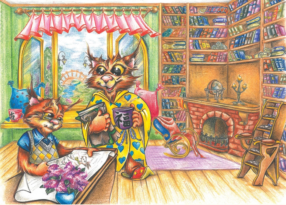 Какангел тут же засеменил к книжному шкафу, проскальзывая по натёртому деревянному полу пушистыми пятками. Высмотрев что-то наверху, он подтащил своё любимое кресло-трансформер. Одно движение – и кресло превратилось в удобную стремянку. Надев мягкие тапочки, осторожно наступая на ступеньки, Какангел начал подниматься. За ним с тревогой наблюдал Очертяка. Какангел обожал свою стремянку, но ему ещё не удалось приручить её. От высоты у него кружилась голова.