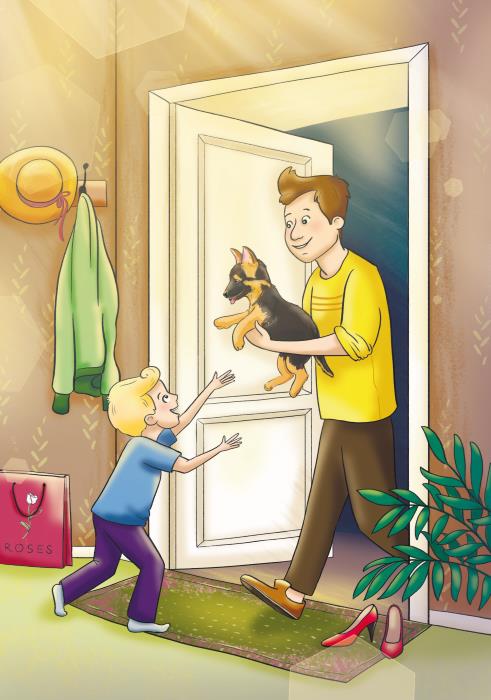 Папа мой – в командировке.Я хожу без остановки и с утра твержу упрямо:«Я хочу собаку, мама!»В понедельник, не зевая, попросил я алабая.«Алабай – собака злая, нам не нужен алабай,Ты другую выбирай!»А во вторник я у мамы попрошу-ка добермана.«Добермана не проси, он соседа укусил».Попросил бульдога в среду я у мамы за обедом.«Твой бульдог как носорог, очень много ест бульдог.И друзей, гостей не пустит к нам в квартиру на порог».Снова я прошу в четверг: «Может, подойдёт нам цверг?»«Цверга надо подстригать, шерсть повсюду убирать».Попрошу я в пятницу: «Мне хаски очень нравится.Стала мне она теперь даже часто сниться».И сказала мама: «Какой же ты упрямый!От подруг я знаю: порода дорогая».Я, совсем уже без сил, и в субботу попросил:«Никого из них не надо, может, заведём дворнягу?Чтобы был не одинок, очень нужен мне щенок».«Всё, сдаюсь! – сказала мама. —Мы вместе с бабушкой Светланой в это воскресеньеНа твой день рождения приготовили подарки,Чтобы был твой праздник ярким».Подарили мне конструктор, книжку, робота, лото.Всё равно мне грустно что-то, говорю: «Опять не то!»Раздаётся в дверь звонок. Я бегу не чуя ног.Это папа мой с работы, с ним подарок – мой щенок!Всем «спасибо» говорю и за всё благодарю.А щенок овчарки – лучше всех подарков!Конец командировке! Приступим к дрессировке!