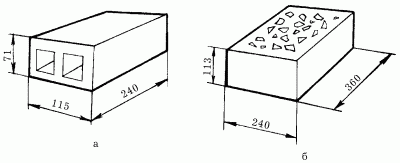 Рис. 19. Кирпичи (размеры даны в мм): а – продольно-дырчатый; б – вертикально-дырчатый.