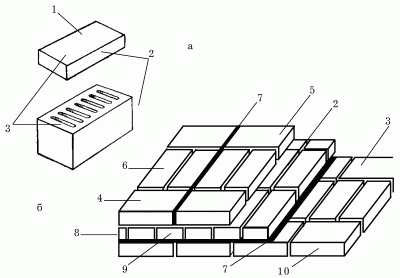 Рис. 21. а – стороны кирпича и камня; б – элементы каменной кладки: 1 – постель; 2 – ложок; 3 – тычок; 4 – наружная верста; 5 – внутренняя верста; 6 – забутка; 7 – горизонтальный шов; 7 – вертикальный шов; 8 – фасад; 9 – тычковый ряд; 10 – ложковый ряд.
